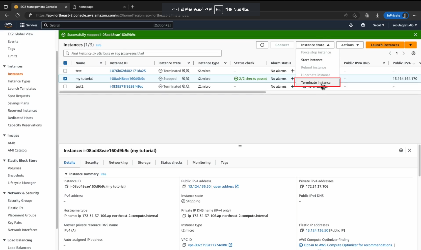 지난시간에 켰었던 서버를 끄도록 한다. 끄지 않으면 과금이 발생한다. IP 할당을 하기 위해 다시 킨다.