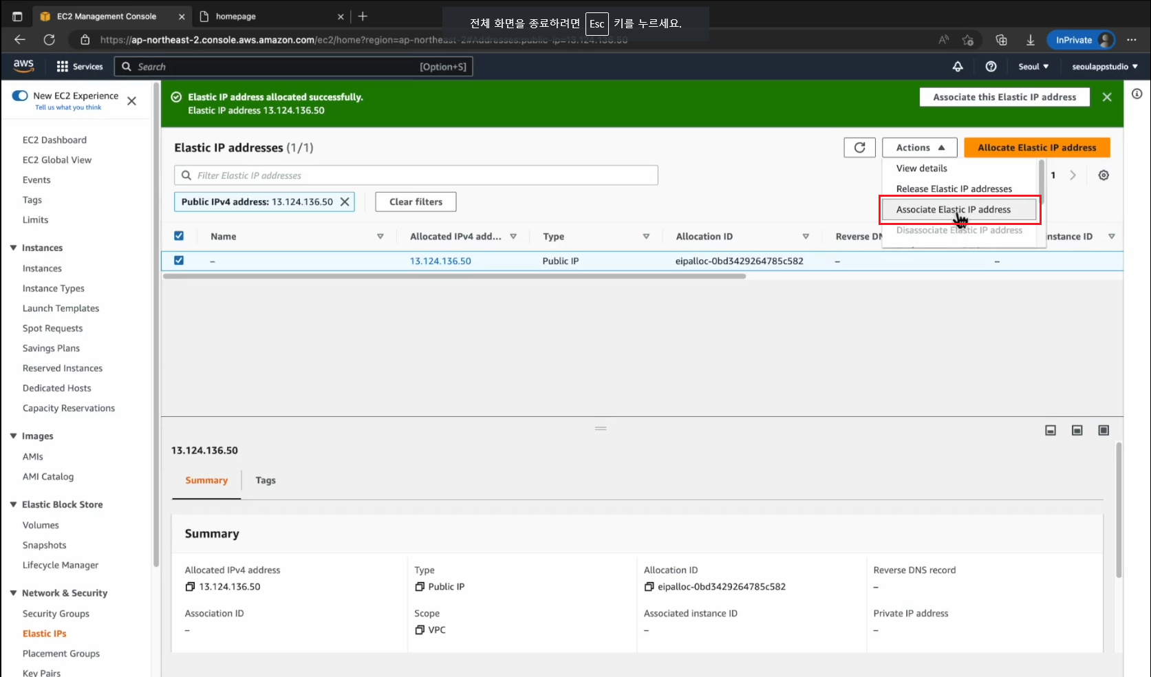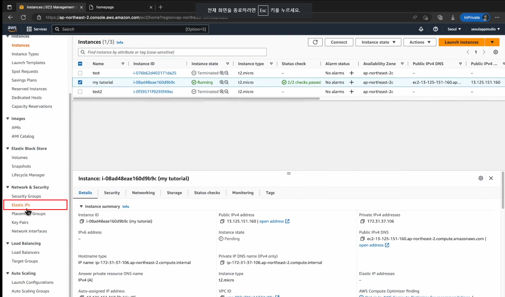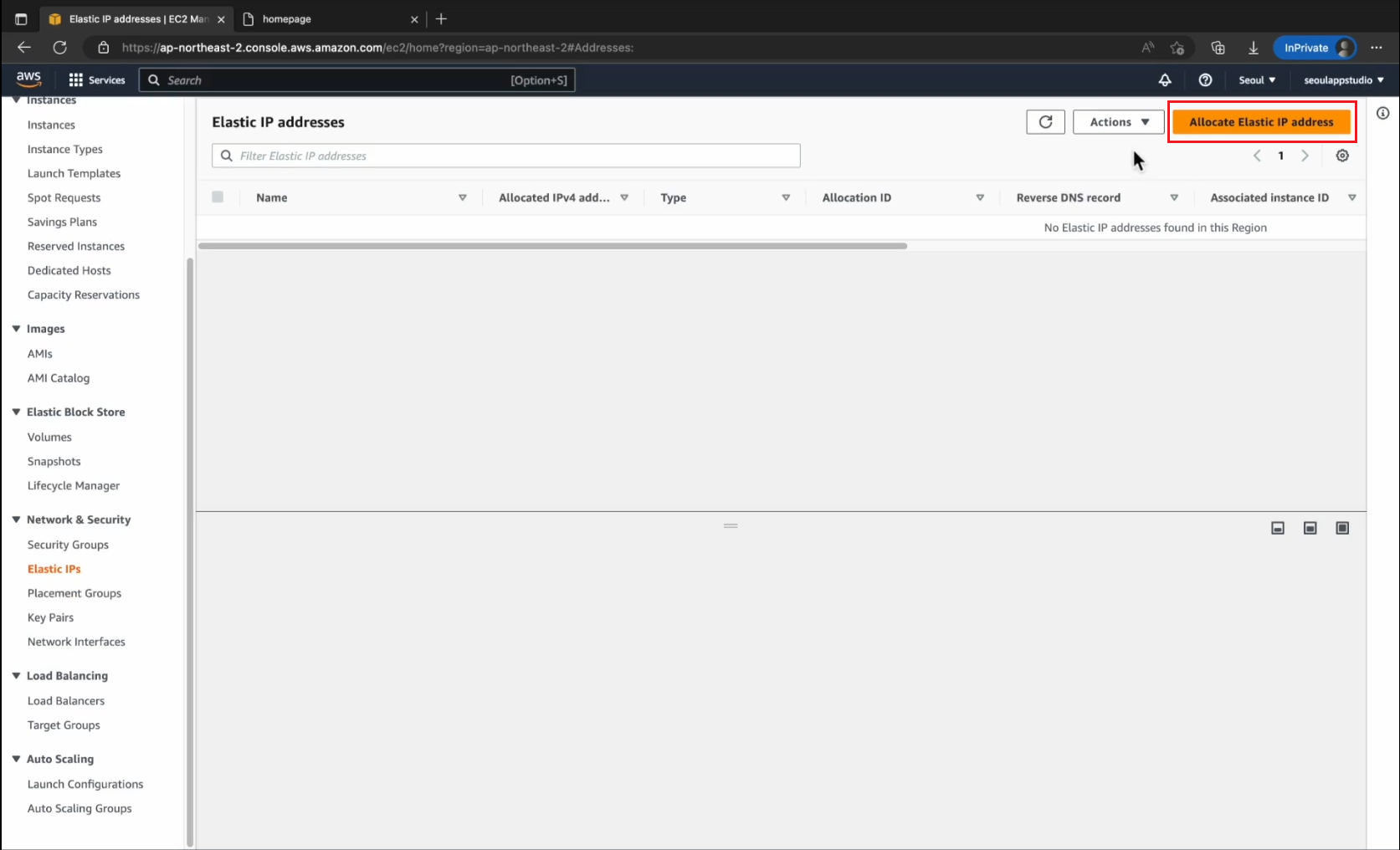 왼쪽 메뉴에서 Elastic IPs 클릭