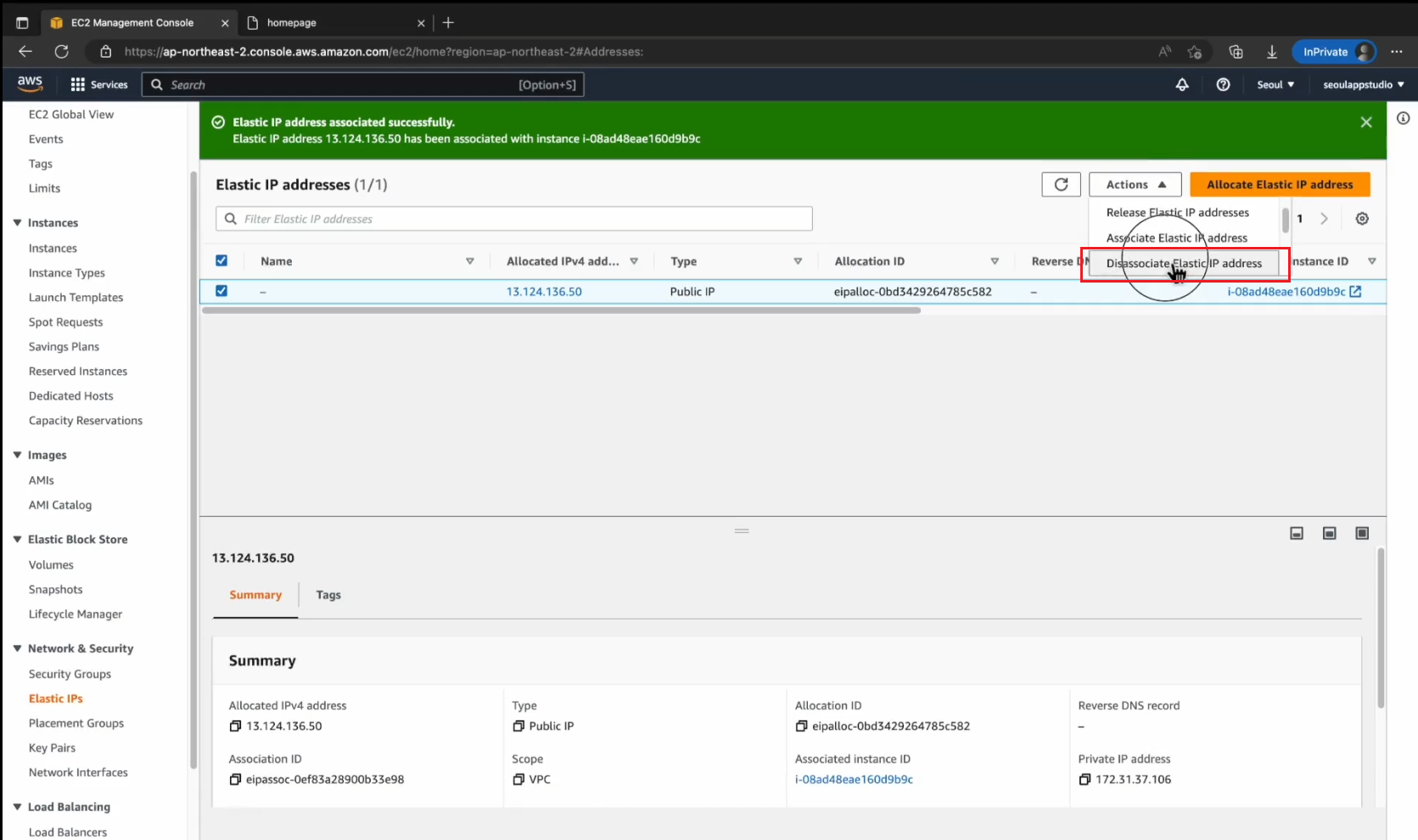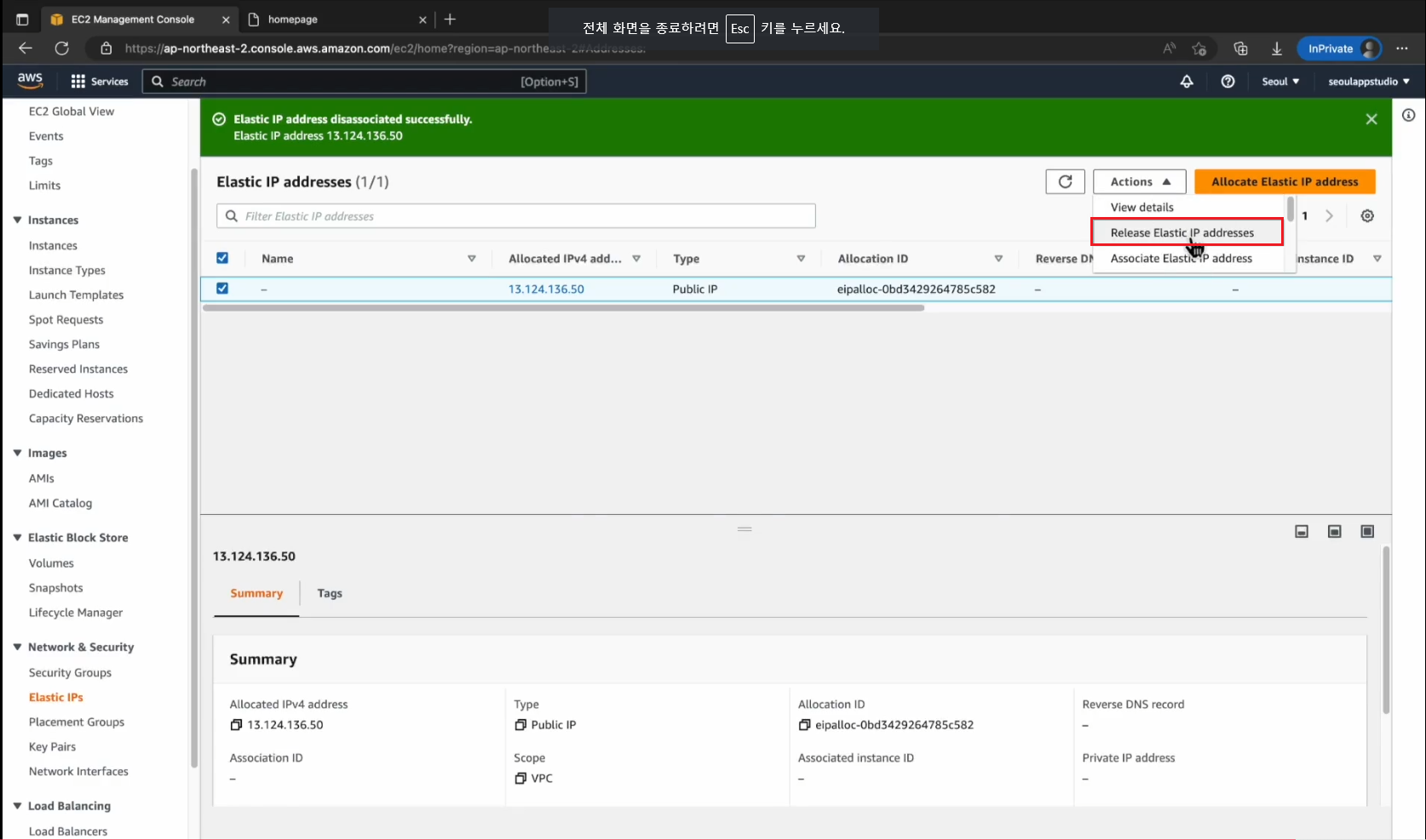 하지만 이렇게 IP를 할당하면 과금이 발생한다. 따라서 다시 해제하도록 한다.