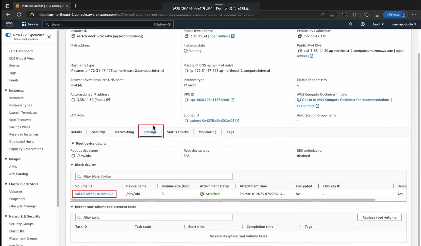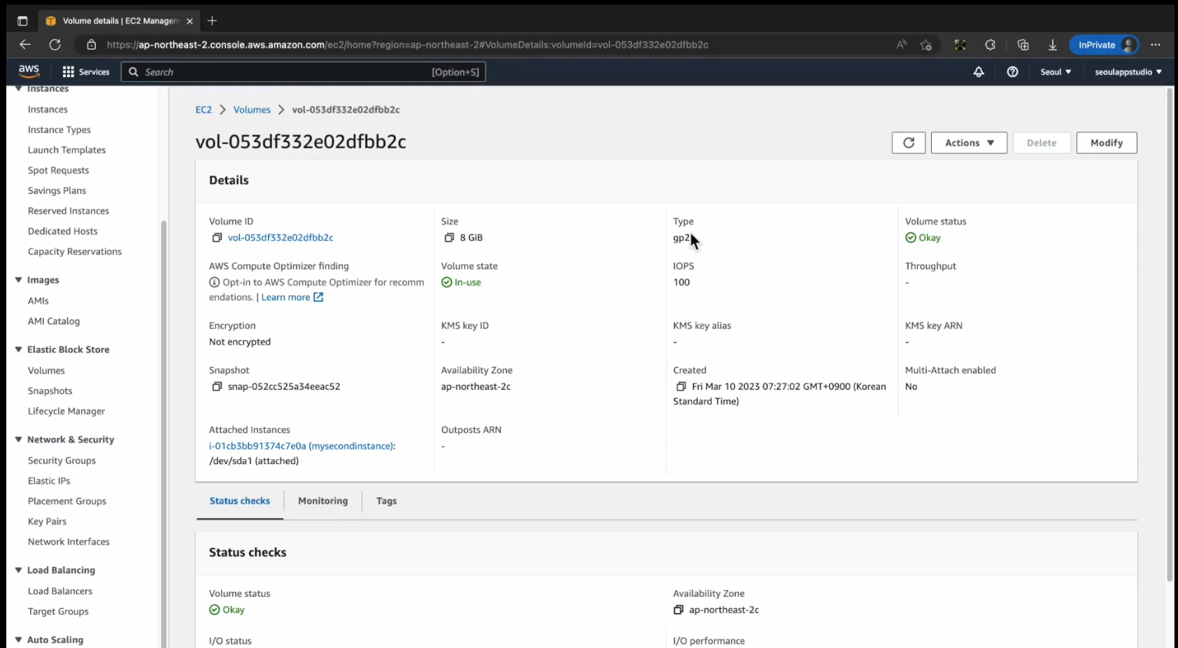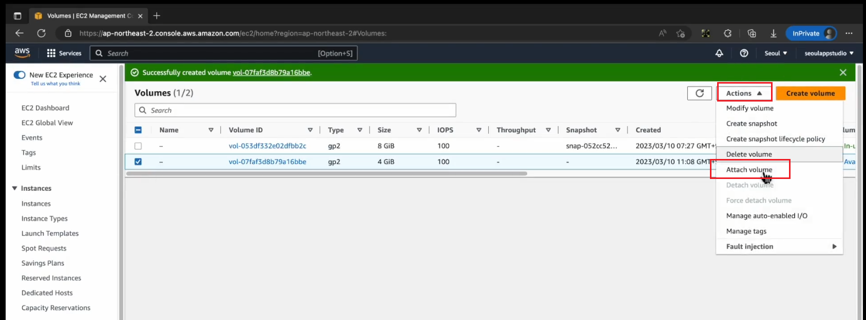현재 볼륨을 인스턴스에 적용시키고 싶다. 볼륨의 상태가 사용가능해질때까지 기다린 후 체크한다.