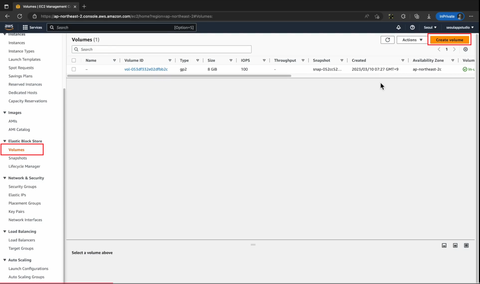 왼쪽 메뉴의 Volumes에 들어가서 오른쪽 상단의 Create volume 클릭