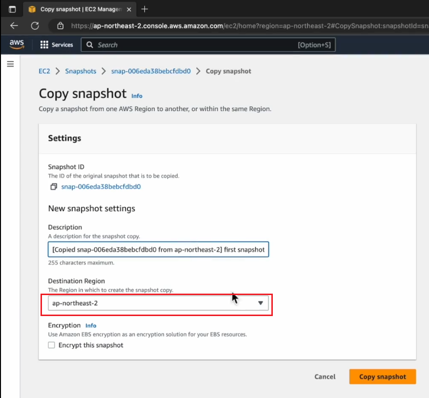 Copy Snapshot을 통해 다른 지역으로 스냅샷을 보낼수도 있다.