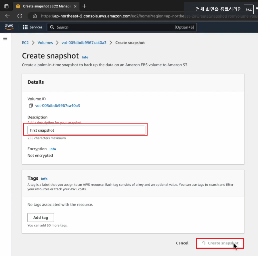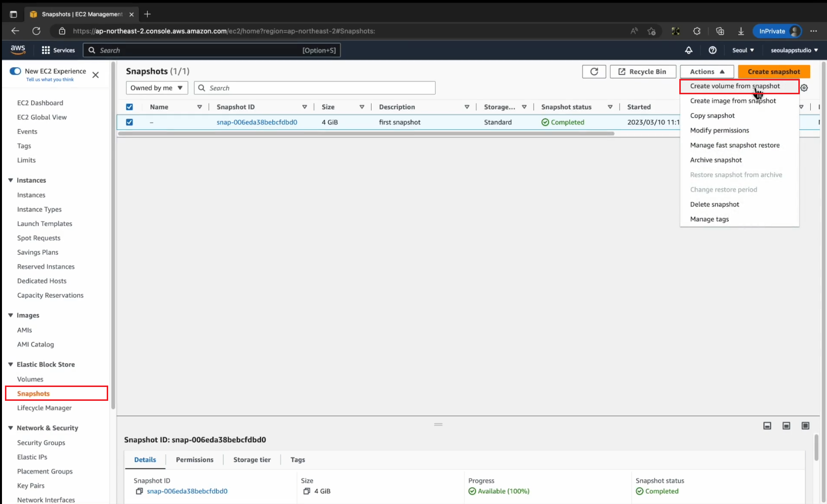 Volume의 스냅샷이 만들어졌다. 만약 Volume이 삭제되더라도 스냅샷이 있다면 사진처럼 Create volume from snapshot을 통해 다시 만들 수 있다.
