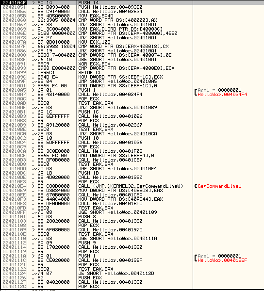 HelloWorld.exe 파일을 OllyDbg로 열어본다.