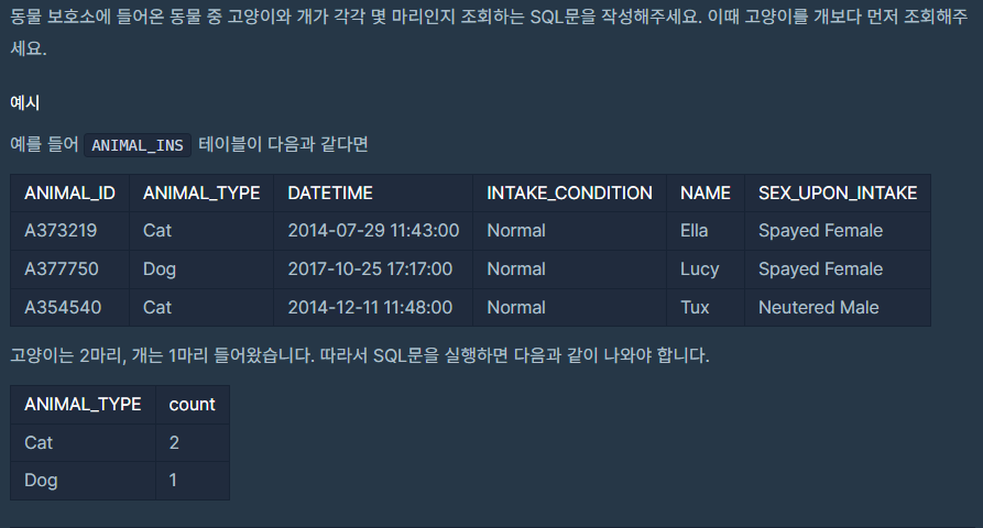 문제 요약 : 고양이와 개 각각의 숫자를 조회한다. 그리고 고양이를 개보다 먼저 조회한다.