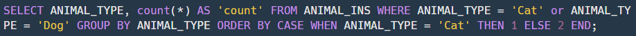 3. ORDER BY CASE WHEN은 ANIMAL_TYPE이 'Cat'이라면, 즉 고양이라면 1첫번째로 아니면 후순위로 출력하게 하였다.