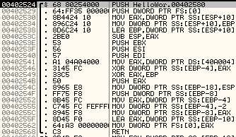 MessageBoxW() API를 호출하는 코드가 있다. 그리고 그 파라미터로 "www.reversecore.com"과 "Hello World!" 문자열이 있다는게 확인된다. 이는 HelloWorld.cpp의 소스코드의 내용과 일치한다. 따라서 401000 함수가 바로 main() 함수이다.