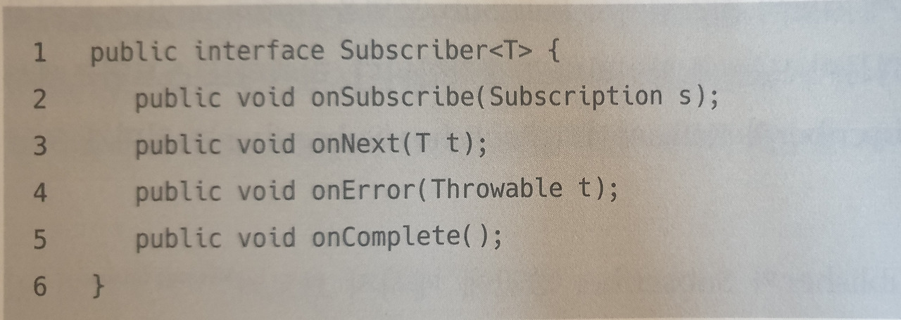 코드 2-2는 Subscriber 인터페이스의 코드이다. Subscriber 인터페이스는 총 네 개의 메서드를 구현해야 한다.