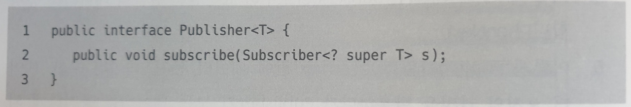 코드 2-1은 Publisher 인터페이스 코드인데, 코드 형태는 subscribe 메서드 하나만 구현하면 되는 수준으로 매우 단순하다.