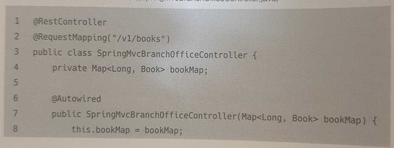 지점 API 서버는 애플리케이션이 실행될 때 내부적으로 Map에 샘플 도서 정보를 미리 저장해 둔다. 원칙적으로 데이터베이스 같은 저장소에 저장된 도서 정보를 조회하는 것이 맞지만 편의상 Map에 저장한 것이다.