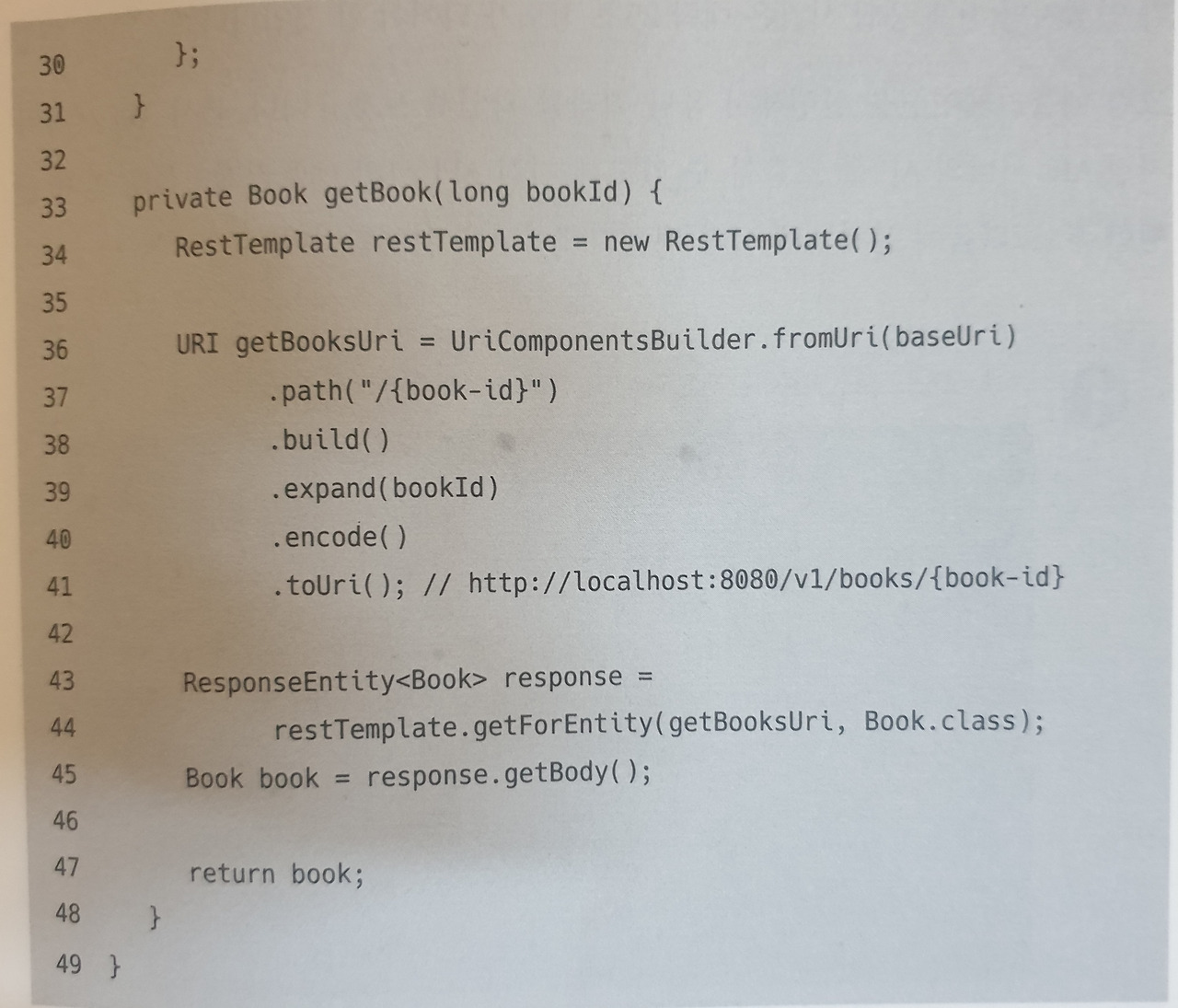 코드 3-1에서는 Spring MVC에서 사용하는 RestTemplate을 사용해 요청 전송 후, 응답으로 전달받은 도서 정보를 ResponseEntity 클래스를 사용해서 반환했다.