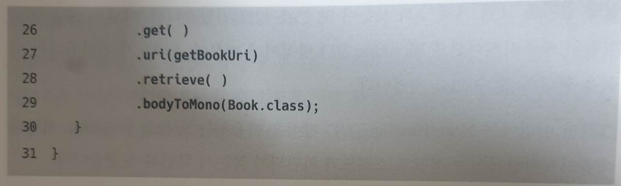 반면에 코드 3-4에서는 WebClient를 사용해서 요청을 전송한 후, 응답으로 전달받은 도서 정보를 포함한 Mono 타입으로 바꾸는 과정(29번 라인)을 거친 후에 최정적으로 Mono 타입의 객체를 반환한다.