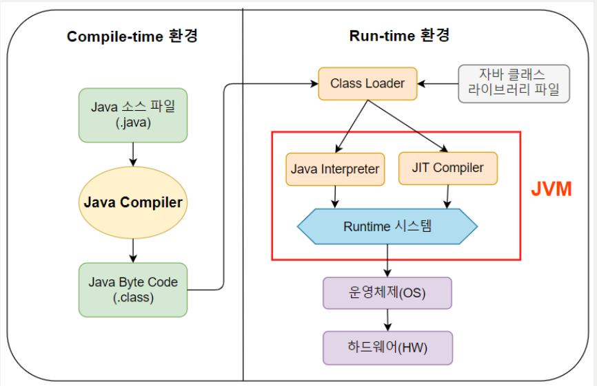 인터프리터 : .class 코드 해석기로서 운영체제가 읽은 바이트 코드를 기기(기계)가 실행할 수 있는 기계어로 번역