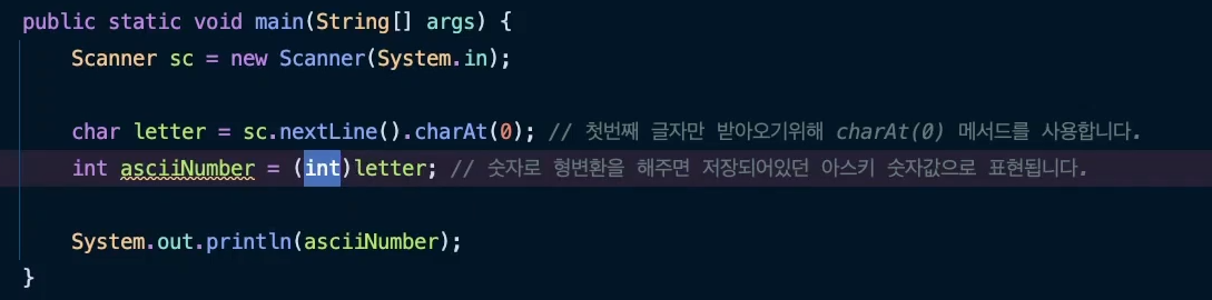 - 그중에 Java에서는 기본적으로 아스키코드 라는 규칙으로 문자를 저장(표현)한다.