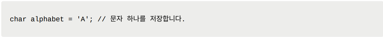문자 한개만 저장하며 홀따옴표를 사용해 값을 저장한다.