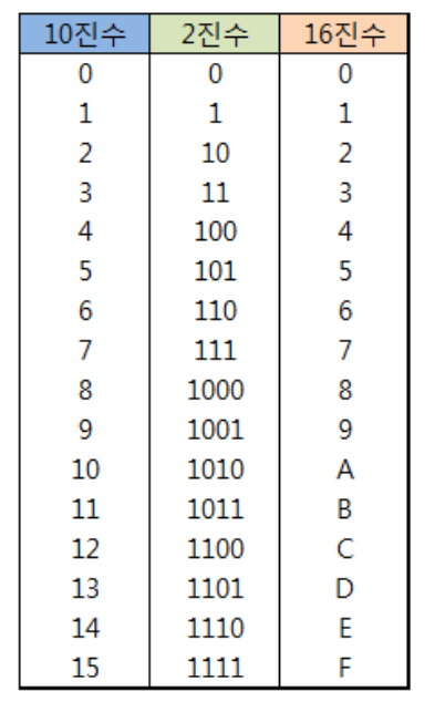 - 4개의 Bit를 사용해 16진수 숫자(0~F)를 2진수로 저장 및 표현한다.
