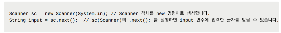 Java에서는 기본적으로 Scanner.in 객체의 next() 명령을 사용해 입력을 받는다.