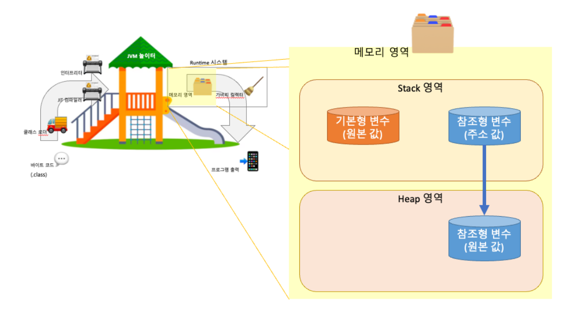 - 참조형 변수 = 원본 값이 Heap 영역에 있다. Stack영역에는 따로 원본값의 Heap 영역 주소를 저장한다.
