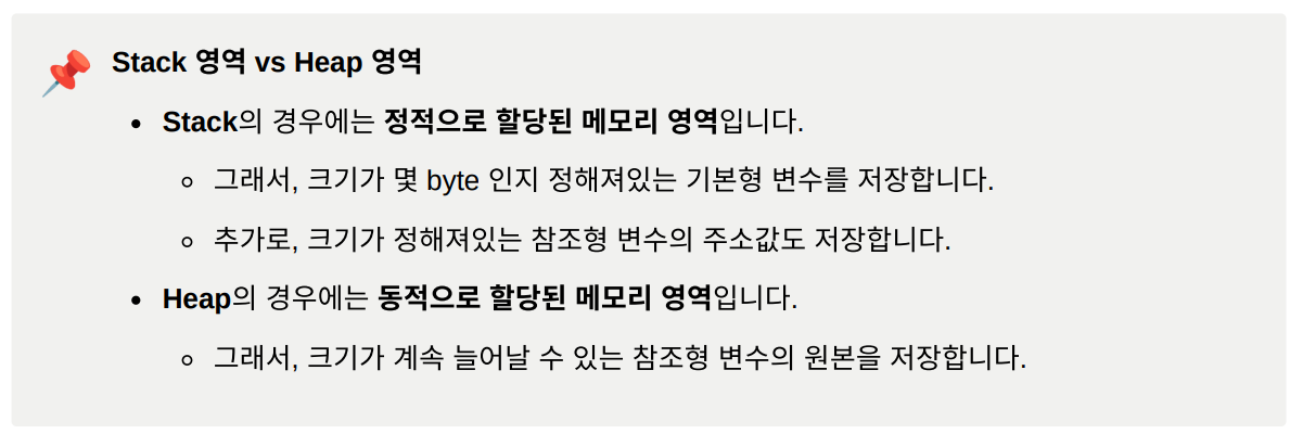 - 참조형 변수 = 원본 값이 Heap 영역에 있다. Stack영역에는 따로 원본값의 Heap 영역 주소를 저장한다.