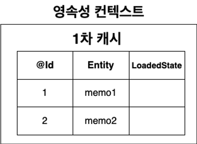 1차 캐시영속성 컨텍스트는 내부적으로 캐시 저장소를 가지고 있다. 우리가 저장하는 Entity 객체들이 1차 캐시 즉, 캐시 저장소에 저장된다고 생각하면 된다. 캐시 저장소는 Map 자료구조 형태로 되어있다. key에는 @Id로 매핑한 기본 키 즉, 식별자 값을 저장한다. value에는 해당 Entity 클래스의 객체를 저장한다. 영속성 컨텍스트는 캐시 저장소 Key에 저장한 식별자값을 사용하여 Entity 객체를 구분하고 관리한다. 영속성 컨텍스트가 이 캐시 저장소를 어떻게 활용하고 있는지 살펴보자Entity 저장em.persist(memo); 메서드가 호출되면 memo Entity 객체를 캐시 저장소에 저장한다. jpa-core 프로젝트 실행 테스트 폴더에 PersistenceTest 클래스 파일 만..